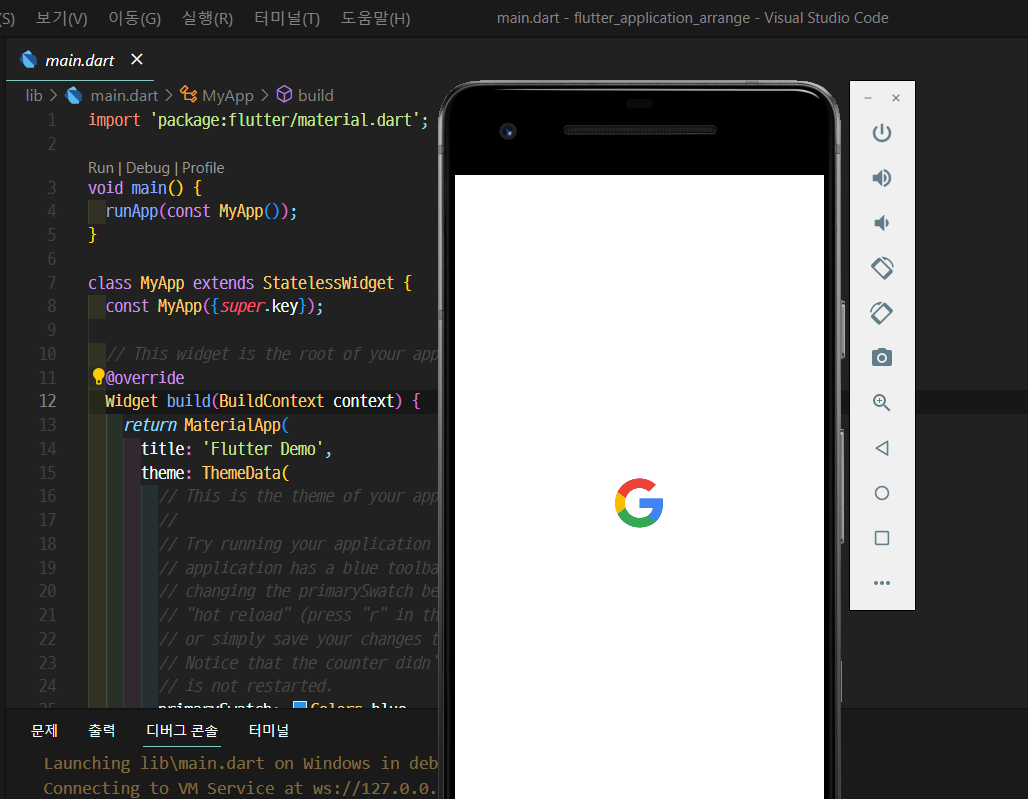 AVD를 선택하면 아래와 같이 비주얼스튜디오(vscode)에서 애뮬레이터로 실행할 수 있게 된다.